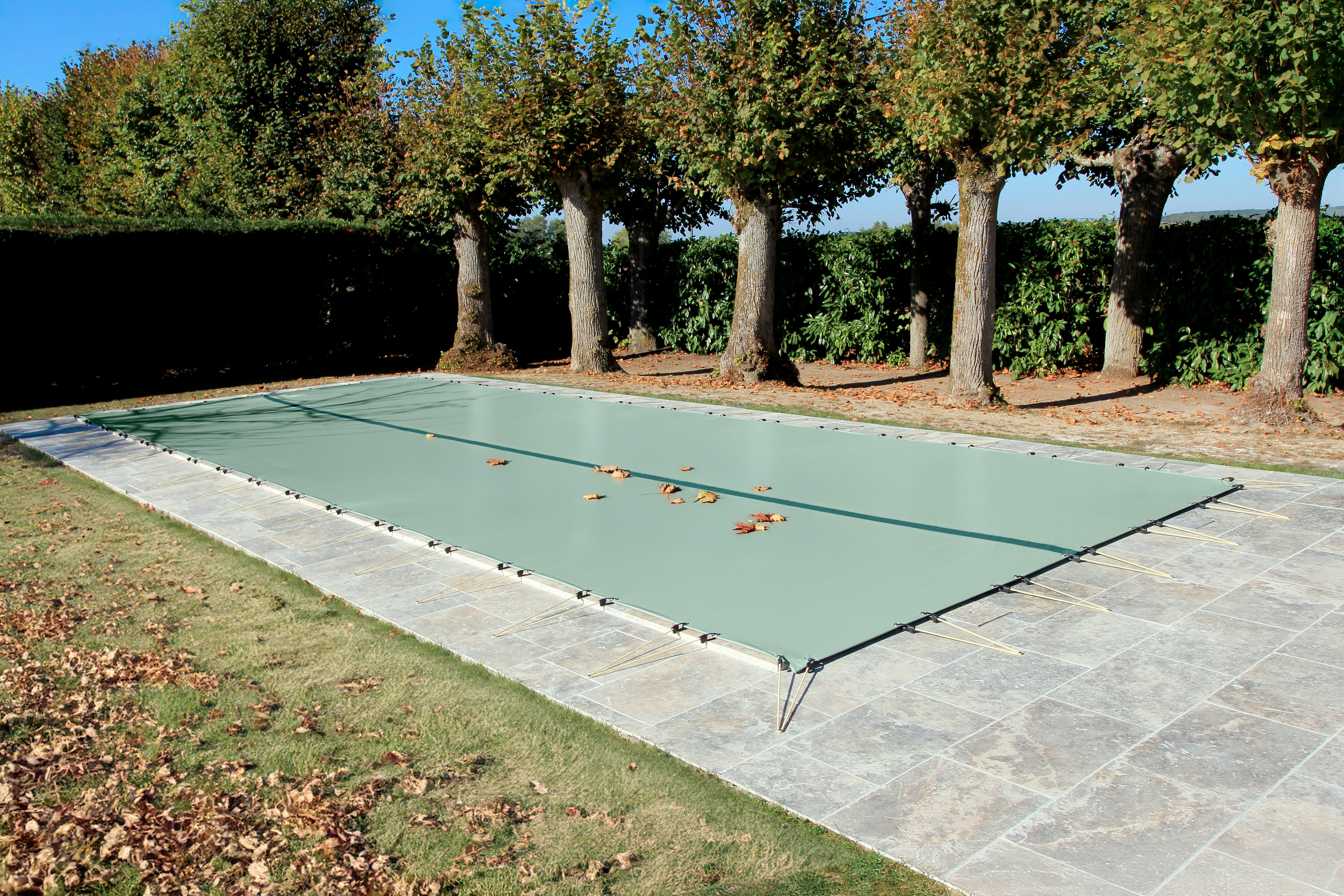 Sans protection, les feuilles s’accumulent et, petit à petit, se décomposent au fond de la piscine. Cela peut entraîner des taches, favoriser la prolifération d’algues et rendre le nettoyage plus laborieux.