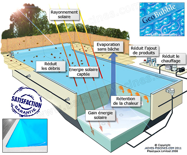 La couverture à bulles repose sur l'eau. Elle peut éventuellement être plus petite que votre bassin, en revanche si la bâche est trop grande vous pourrez la retailler mais aucune garantie ne sera effective si vous la modifiez. |