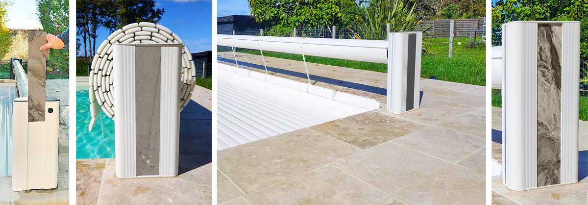 Des poteaux de volet piscine à votre goût.Inserer les plaque PVC décoratives dans la glisiere centrale des bornes pour créer une harmonie avec votre aménagement extérieur. 6 coloris pour 6 ambiances différentes :